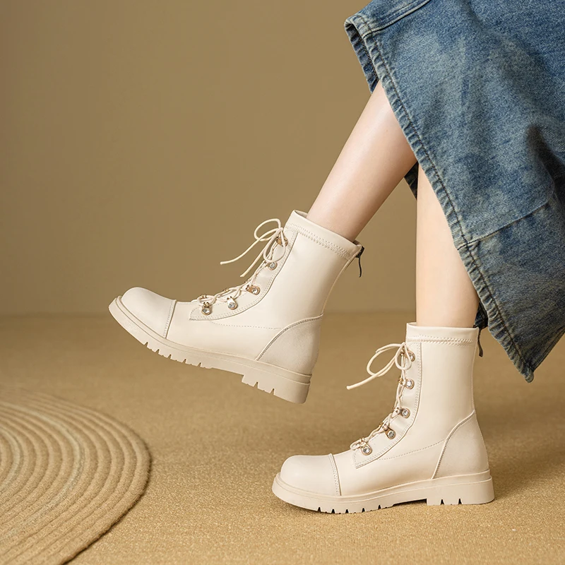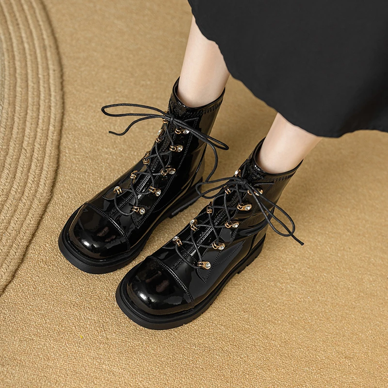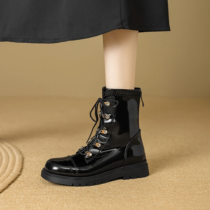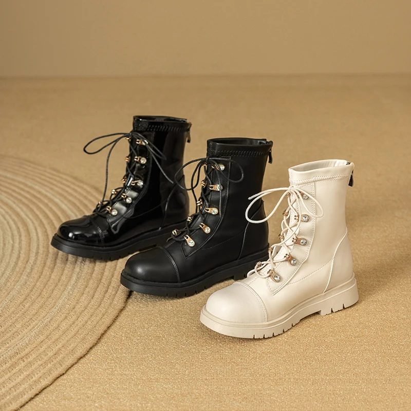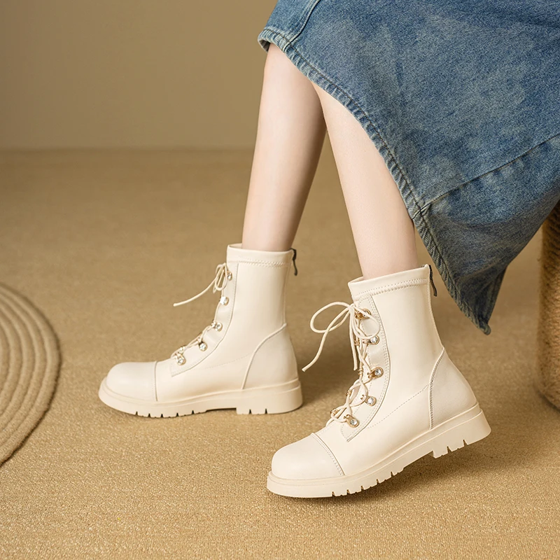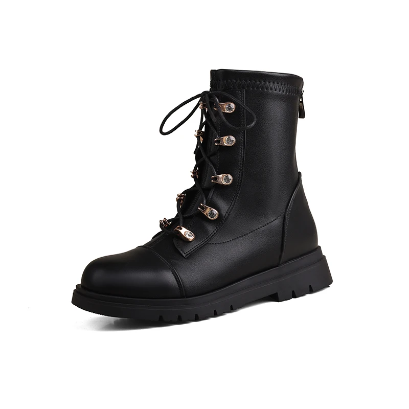 Be the first to review “Metal Buckle Cross Tie Round Head Rubber Anti Slip Thick Bottom Back Zipper British Style Short Boots Plush Lining Knight Boots”