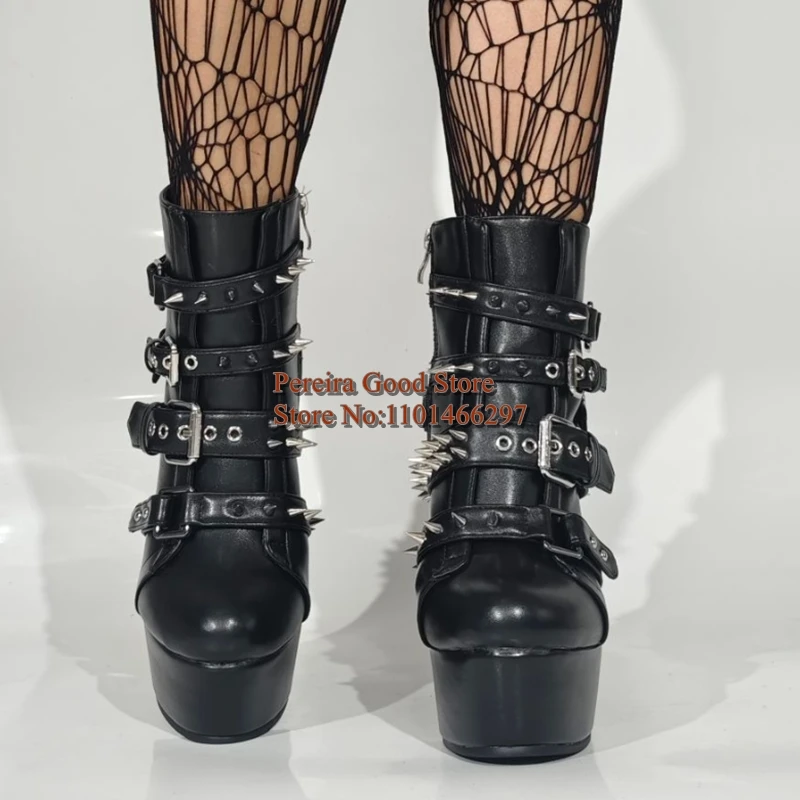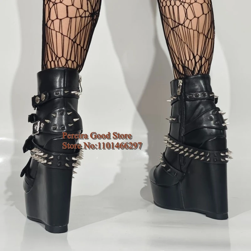 Punk Style Rivets Belt Buckle Straps Women Ankle Boots PU Black Leather Round Toe Height Increasing Studded Spikes Short Booties