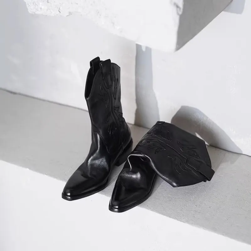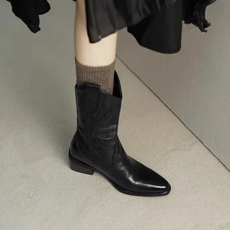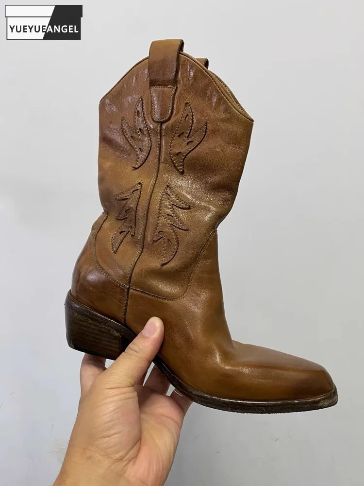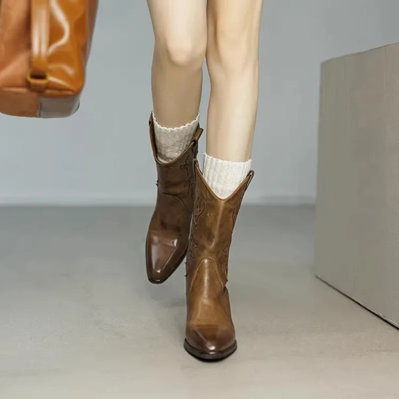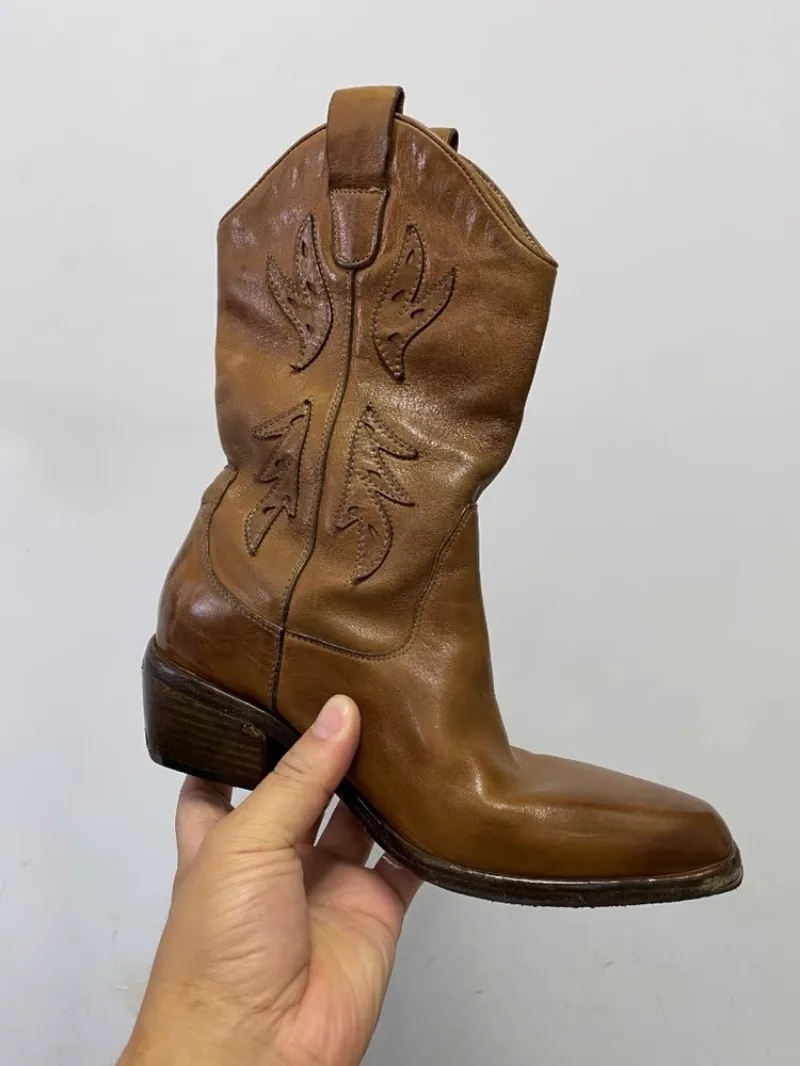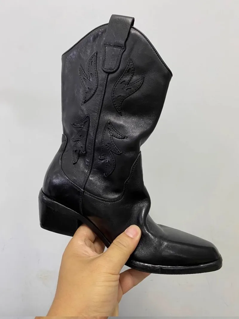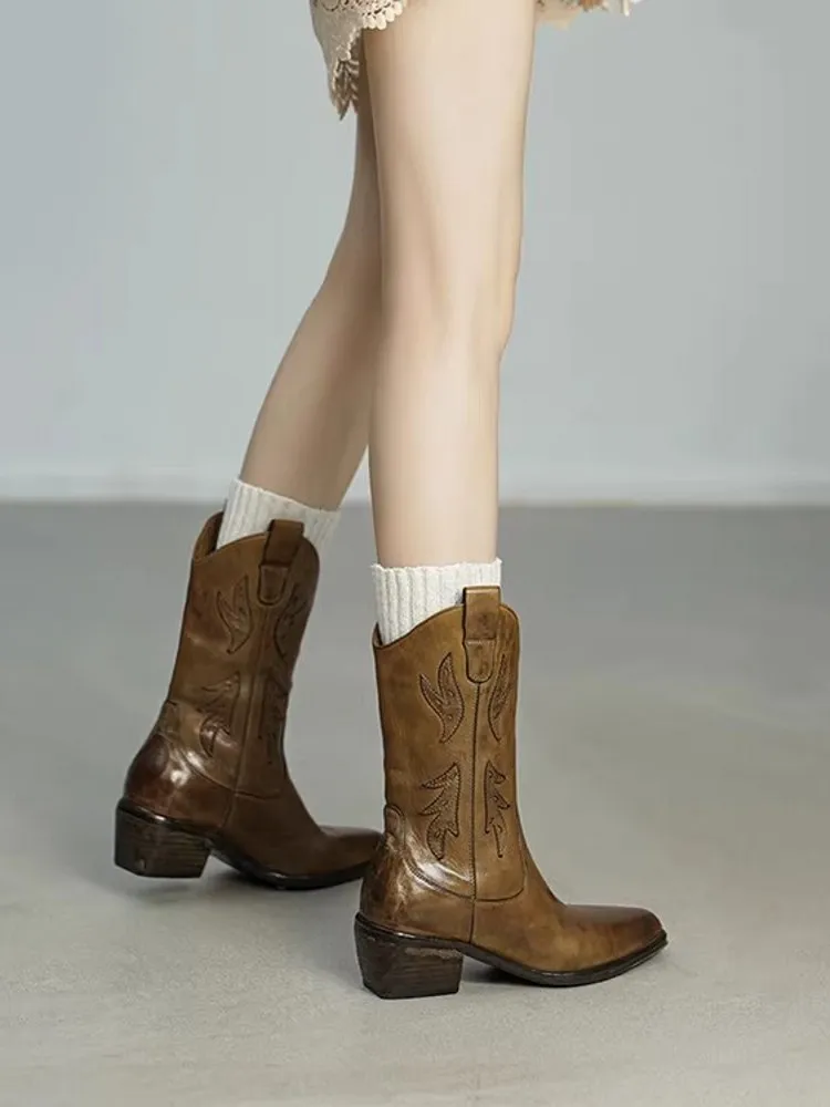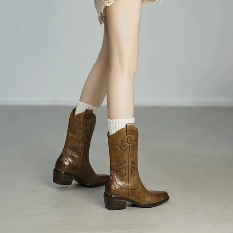 Be the first to review “Vintage Boots Women Embroidery Mid Calf High Top Shoes Horsehide Genuine Leather Pointed Toe Western Boots Slip On Block Heels”