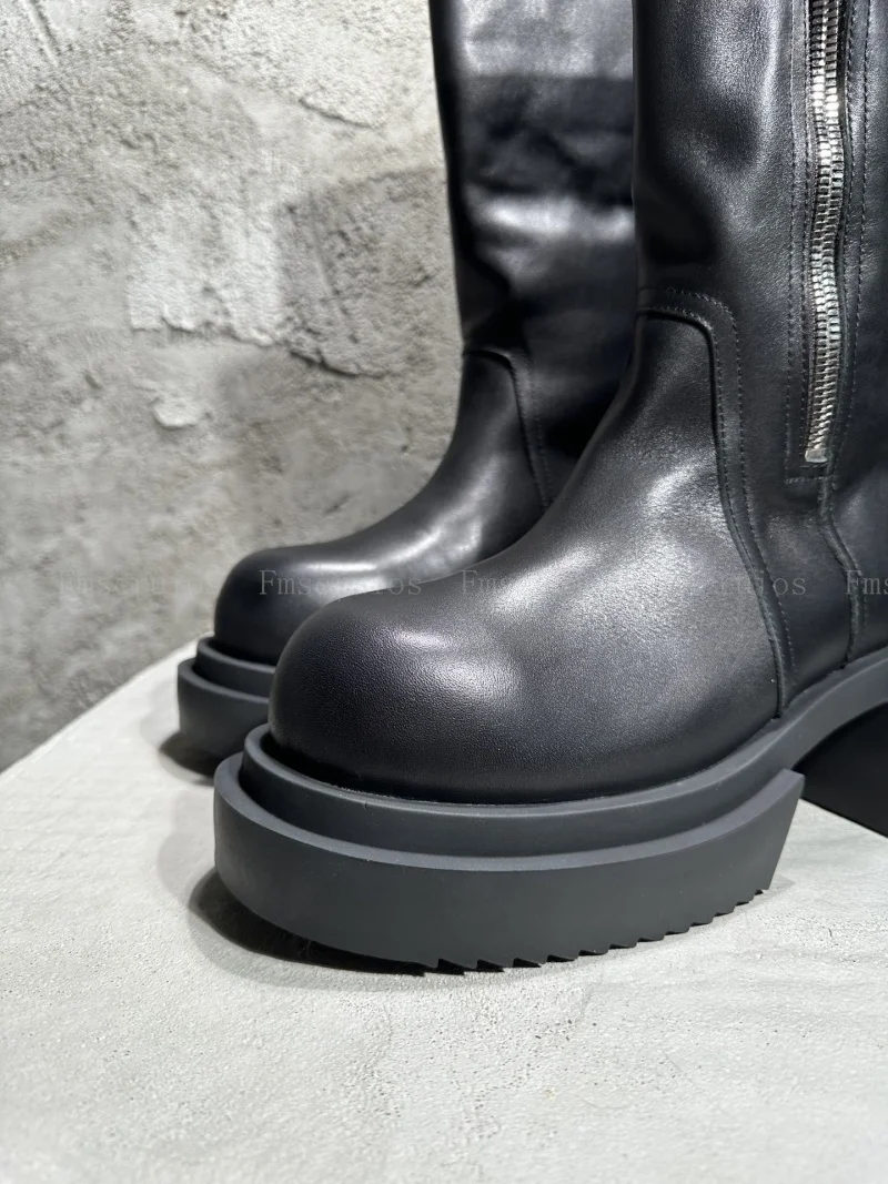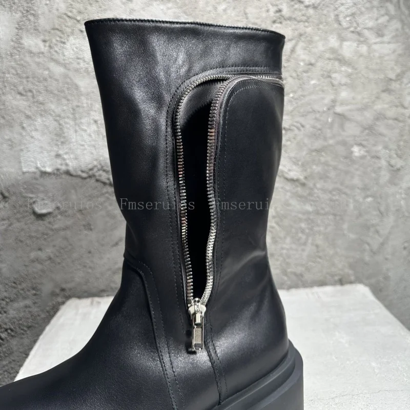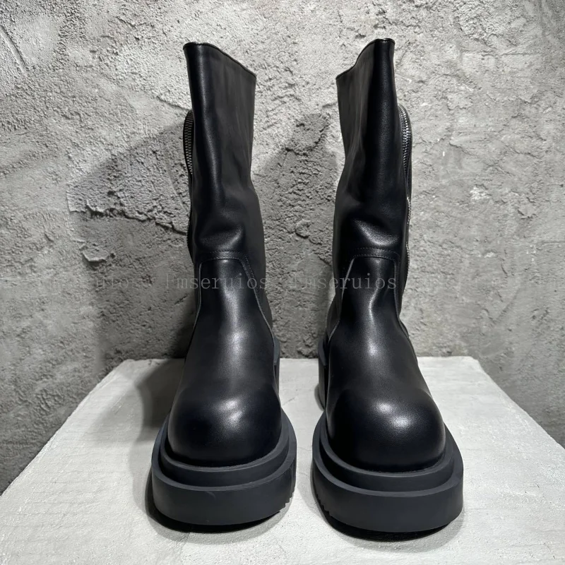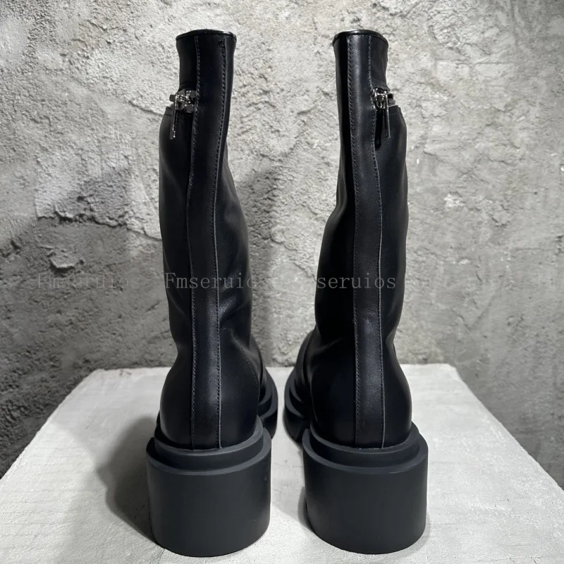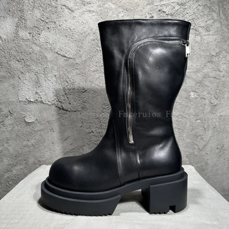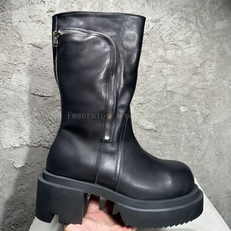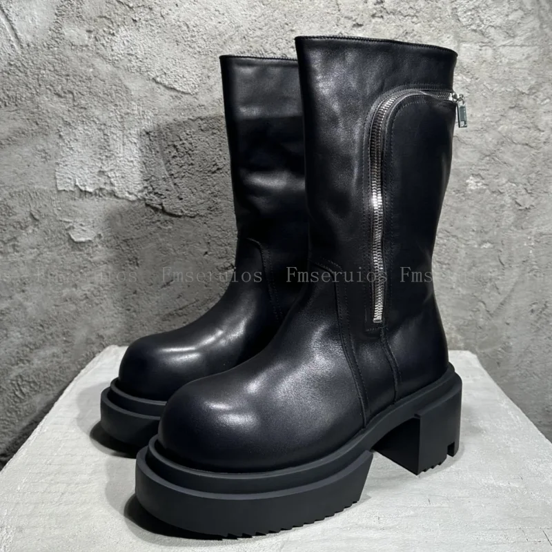 Be the first to review “Women Men Fashion Neutral Mid Calf Boots Round Toe Square Heels Genuine Leather Boots Zipper Design Black High Quality Boots”